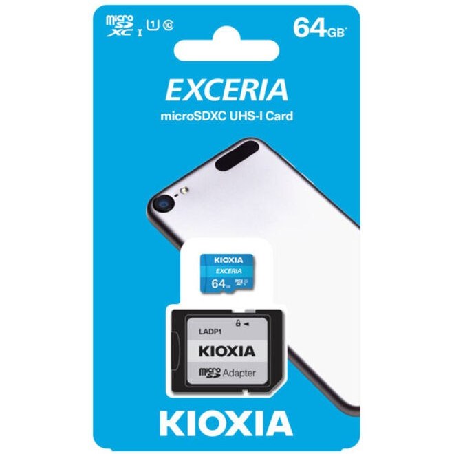 کارت حافظه microSDHC کیوکسیا مدل Exceria کلاس 10 استاندارد UHS-I U1 سرعت 100MBps ظرفیت 64 گیگابایت به همراه آداپتور SD و برای ذخیره سازی ویدئوها کاملا مناسب است.