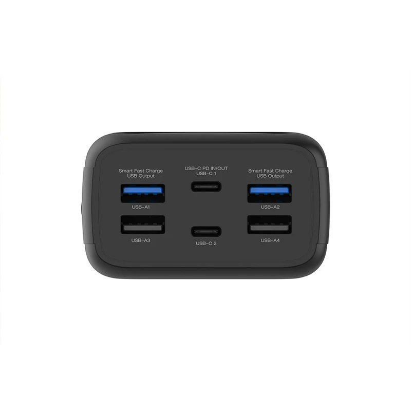 پاوربانک UE30063PQ دارای 6 پورت میباشد که شامل یک پورت مشترک ورودی/خروجی تایپ سی، یک پورت خروجی تایپ سی و 4 پورت خروجی USB-A است. پورت ورودی به همراه نرخ ولتاژ و جریان آن عبارتند از: